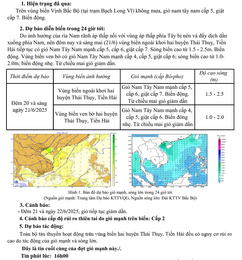 TIN DỰ BÁO GIÓ MẠNH, SÓNG LỚN TRÊN VÙNG BIỂN TỈNH THÁI BÌNH (16h00 NGÀY 20/6/2025)