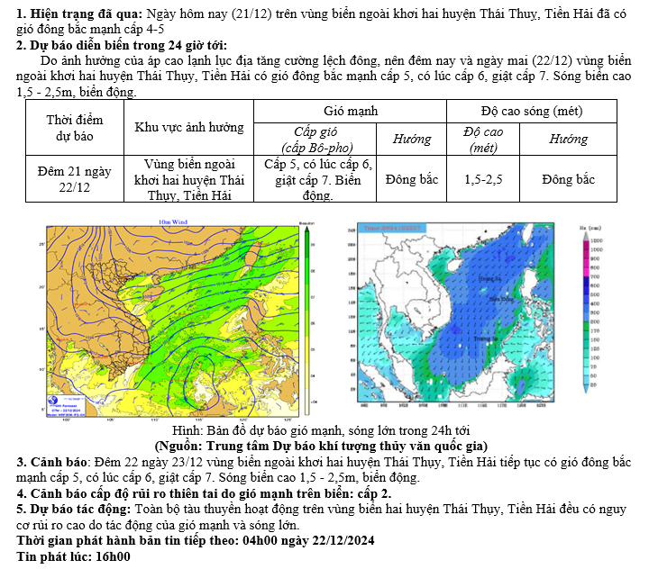 TIN DỰ BÁO GIÓ MẠNH, SÓNG LỚN TRÊN VÙNG BIỂN TỈNH THÁI BÌNH (16h00 NGÀY 21/12/2024)
