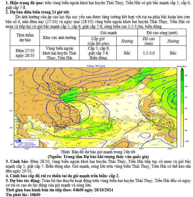 TIN DỰ BÁO GIÓ MẠNH, SÓNG LỚN TRÊN VÙNG BIỂN TỈNH THÁI BÌNH (16h00 NGÀY 27/10/2024)