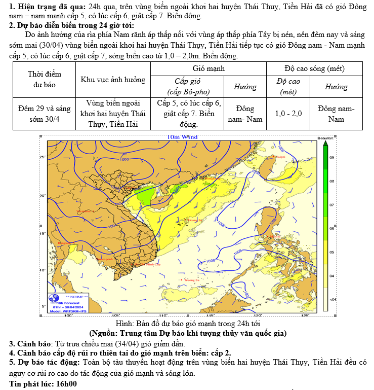 TIN DỰ BÁO GIÓ MẠNH, SÓNG LỚN TRÊN VÙNG BIỂN TỈNH THÁI BÌNH (16H00 NGÀY 29/04/2024)