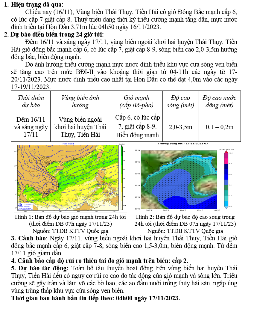 TIN DỰ BÁO GIÓ MẠNH, SÓNG LỚN, TRIỀU CƯỜNG TRÊN VÙNG BIỂN KHU VỰC THÁI BÌNH ( 16h00 ngày 16/11/2023)