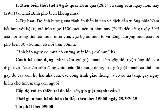 TIN DỰ BÁO MƯA DÔNG DIỆN RỘNG TẠI THÁI BÌNH (09h0 NGÀY 29/5/2025)