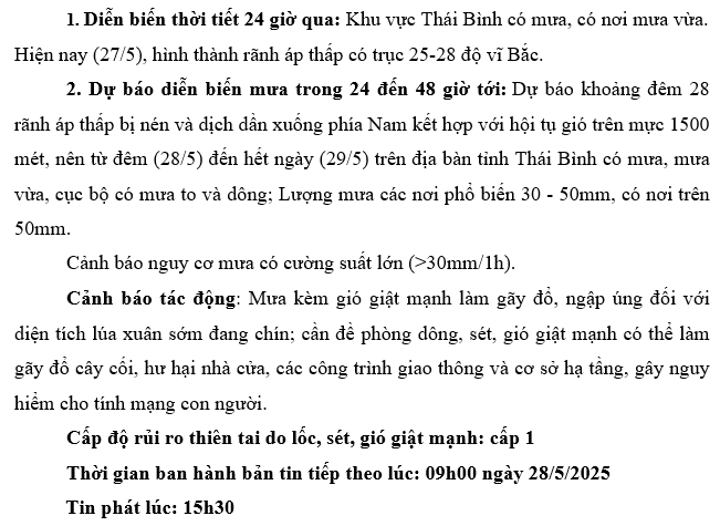 TIN DỰ BÁO MƯA DÔNG DIỆN RỘNG TẠI THÁI BÌNH (15h30 NGÀY 27/5/2025)