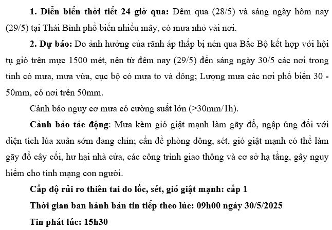 TIN DỰ BÁO MƯA DÔNG DIỆN RỘNG TẠI THÁI BÌNH (15h30 NGÀY 29/5/2025)