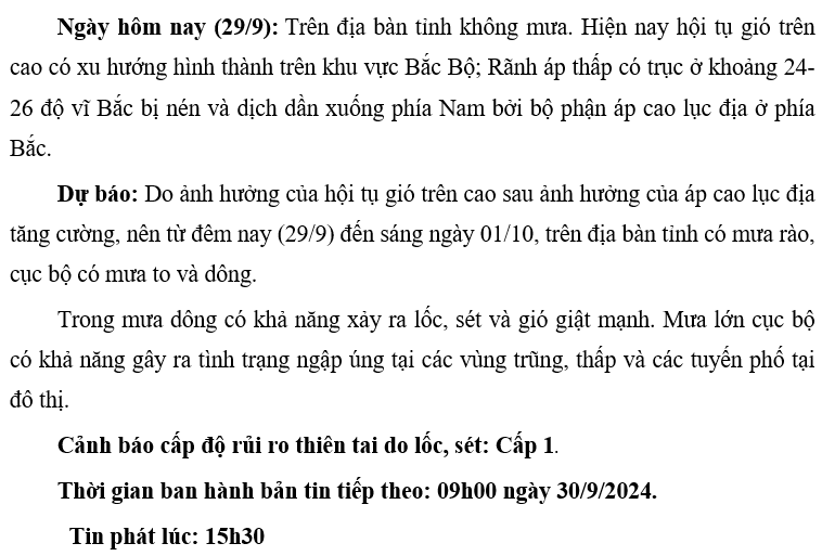 TIN DỰ BÁO MƯA DÔNG DIỆN RỘNG TẠI THÁI BÌNH (15h30 NGÀY 29/9/2024)