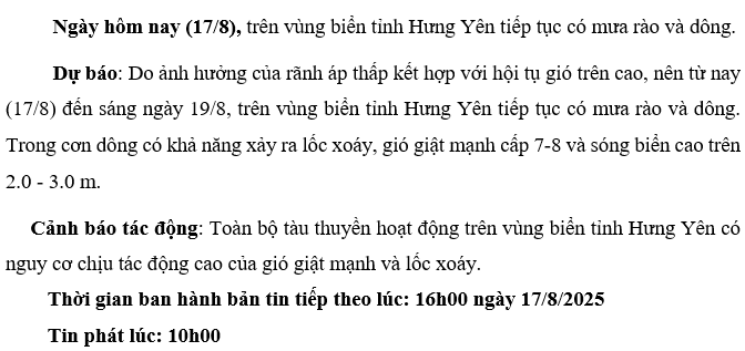 TIN DỰ BÁO MƯA DÔNG TRÊN VÙNG BIỂN TỈNH HƯNG YÊN (10h00 ngày 17/8/2025)