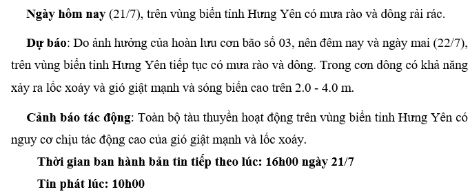TIN DỰ BÁO MƯA DÔNG TRÊN VÙNG BIỂN TỈNH HƯNG YÊN (10h00 ngày 21/7/2025)