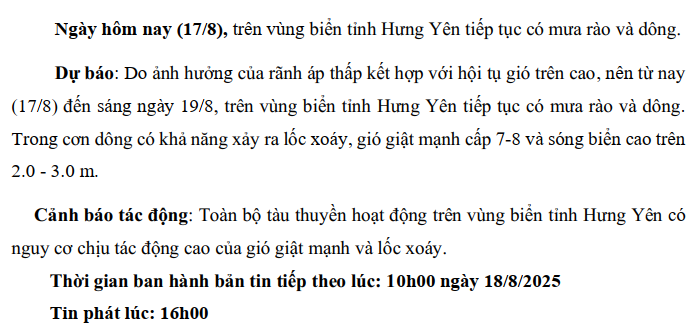 TIN DỰ BÁO MƯA DÔNG TRÊN VÙNG BIỂN TỈNH HƯNG YÊN (16h00 ngày 17/8/2025)