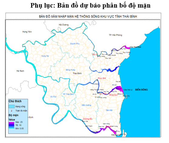 - Phạm vi chịu ảnh hưởng độ mặn 40/00 từ cửa sông Hồng, Trà Lý vào sâu khoảng 8-14km, xuất hiện vào đỉnh triều các ngày 11, 20/01.
