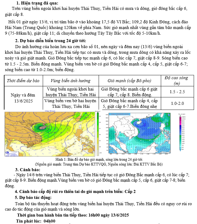 TIN GIÓ GIÓ MẠNH, SÓNG LỚN TRÊN VÙNG BIỂN TỈNH THÁI BÌNH (04h00 ngày 13/6/2025)