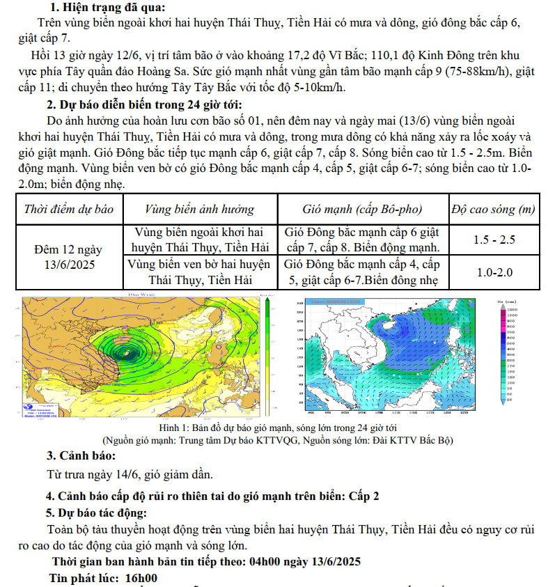 TIN GIÓ MẠNH, SÓNG LỚN TRÊN VÙNG BIỂN TỈNH THÁI BÌNH (16h00 ngày 12/6/2025)