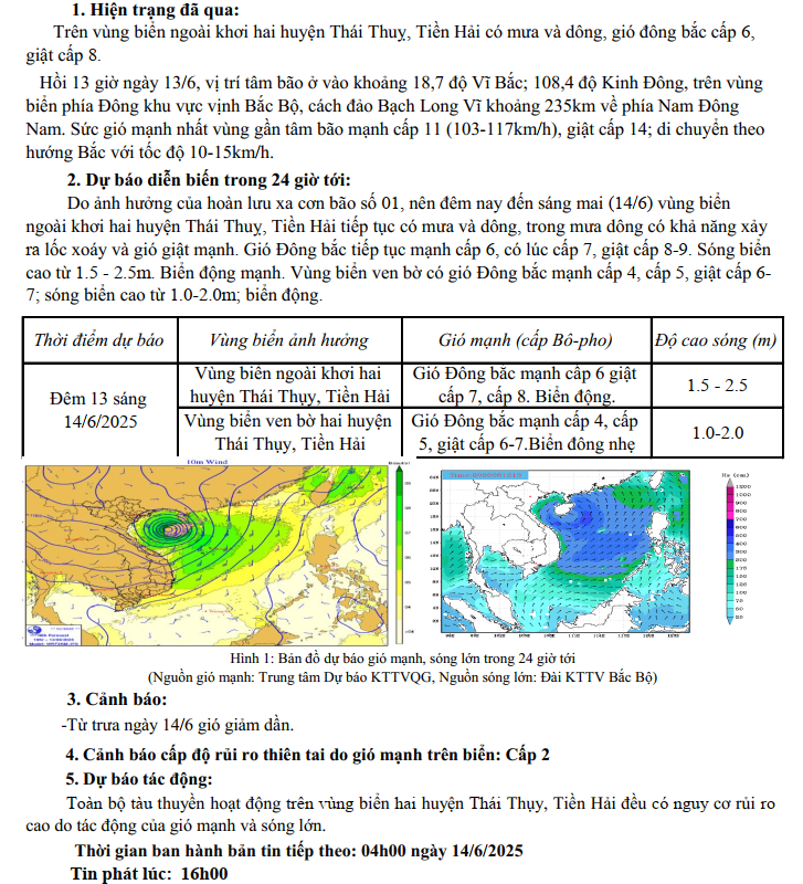 TIN GIÓ MẠNH, SÓNG LỚN TRÊN VÙNG BIỂN TỈNH THÁI BÌNH (16h00 ngày 13/6/2025)