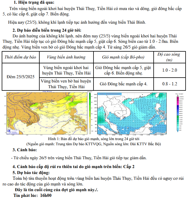 TIN GIÓ MẠNH TRÊN VÙNG BIỂN TỈNH THÁI BÌNH (16h00 NGÀY 25/5/2025)