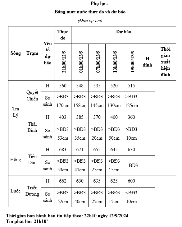 Mực nước lúc 21h00 ngày 12/9 trạm Tiến Đức: 6,83m (cao hơn báo động III: 0,53m); trạm Triều Dương: 6,62m (cao hơn báo động III: 0,52m); trạm Quyết Chiến: 5,60m (cao hơn báo động III: 1,70m), trạm Thái Bình: 4,03m (cao hơn báo động III: 0,53m).