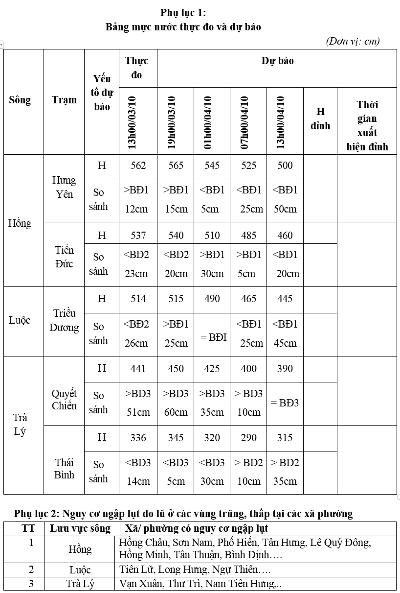 Trong khoảng 6-12h tiếp theo, mực nước trên sông Hồng tại Hưng Yên và Tiến Đức, sông Luộc tại Triều Dương, sông Trà Lý tại trạm Quyết Chiến biến đổi chậm, sau đó mực nước xuống. Đến 01h00 ngày 04/10, mực nước tại các trạm Trạm Hưng Yên, Triều Dương xấp xỉ báo động I, Tiến Đức cao hơn báo động I; trạm Quyết Chiến cao hơn báo động III; trạm Thái Bình dưới báo động III.