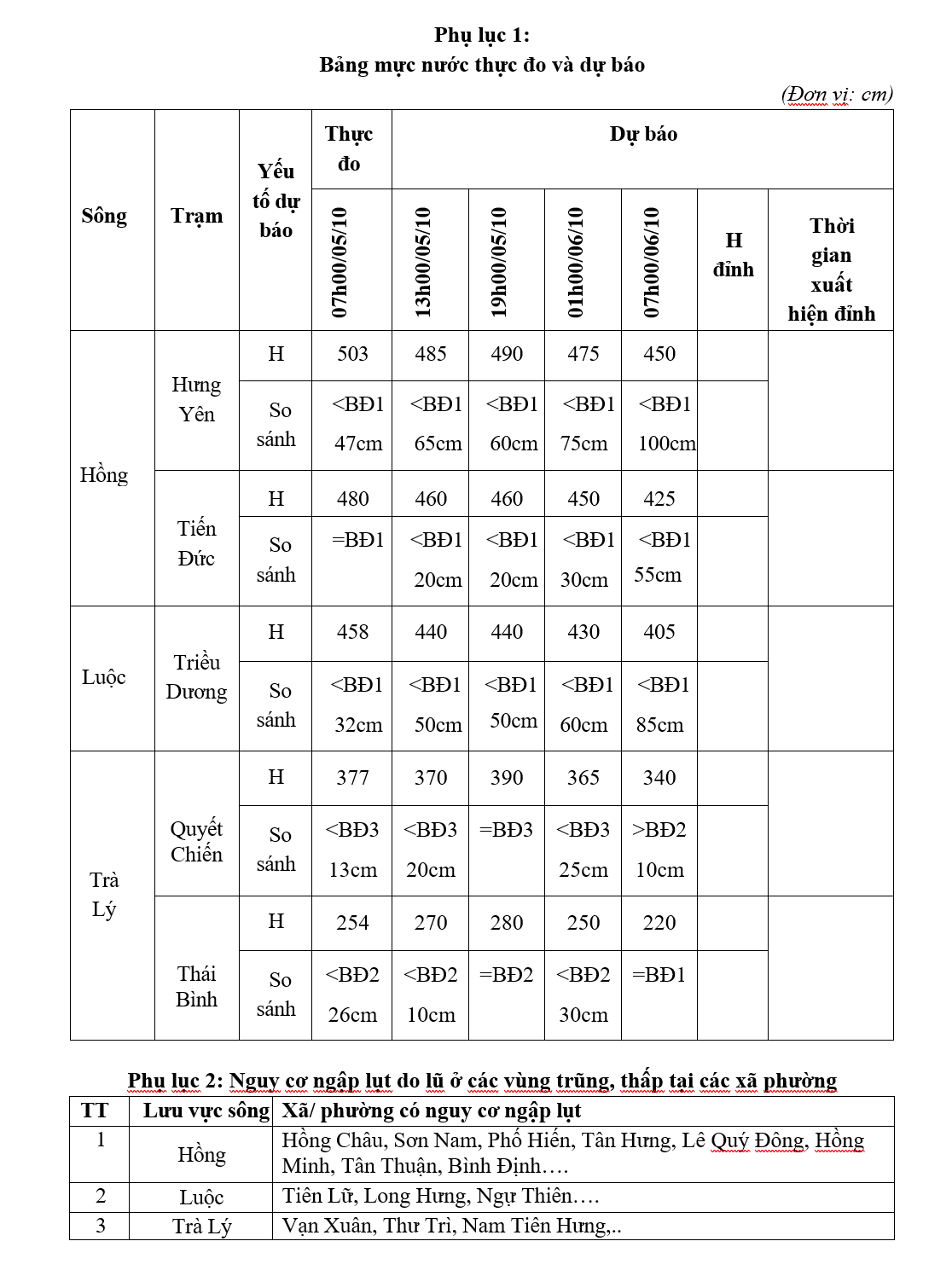 Trong khoảng 12-24h tiếp theo mực nước trên sông Hồng tại Hưng Yên và Tiến Đức, sông Luộc tại Triều Dương; sông Trà Lý tại trạm Quyết Chiến và Thái Bình xuống nhanh. Đến 07h00 ngày 06/10, mực nước các trạm Hưng Yên, Tiến Đức, Triều Dương đều thấp hơn báo động I; Quyết Chiến ở mức báo động BĐII; trạm Thái Bình ở mức báo động I. (Chi tiết tại phụ lục 1).