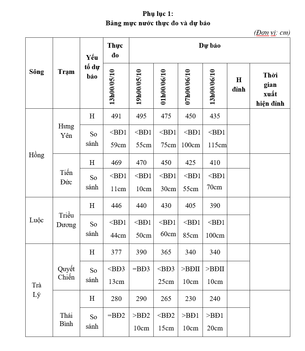 - Mực nước lúc 13h00 (ngày 05/10) trên sông Hồng tại Hưng Yên: 4,91m (<BĐI: 0,59m), tại Tiến Đức: 4,69m (<BĐI: 11cm); sông Luộc tại Triều Dương: 4,46m (<BĐI: 0,44m); sông Trà Lý tại Quyết Chiến: 3,77m (<BĐIII: 0,13m), tại trạm Thái Bình 2,80m (=BĐII).