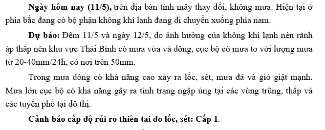 TIN MƯA DÔNG VÀ CẢNH BÁO MƯA LỚN CỤC BỘ, LỐC, SÉT, GIÓ GIẬT MẠNH TẠI THÁI BÌNH (ra ngay 11/5/2024)